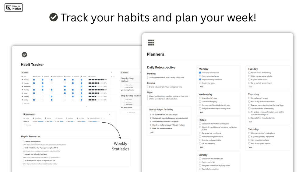 - Habit tracker : Build long-lasting habits with this page that provides you detailed (daily and weekly) statistics.