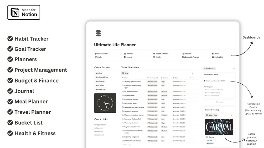 Meet the Ultimate Life Planner, an all-in-one productivity workspace designed to help you organize, plan and live with more intention, structure, and focus.