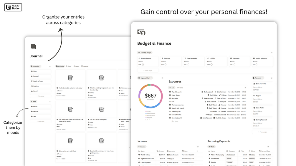 - Journal : Document your life, daily happenings and organize entries across categories such as Personal, Work, Health & Fitness, School...